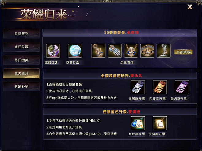 时,拒绝焦虑,自由参与。轻松集齐3套装备,自由领取海量资源,快速账号成