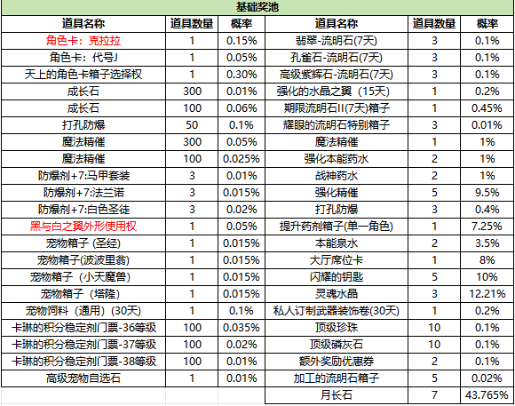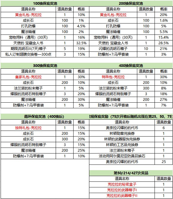 大保底:累计开启达400次后,开启大保底循环,之后每100次可随机获得循环保底奖池内道具。