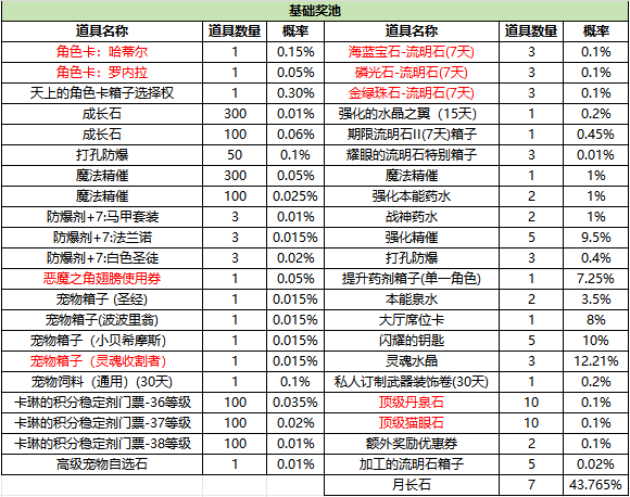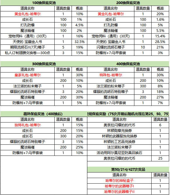 大保底:累计开启达400次后,开启大保底循环,之后每100次可随机获得循环保底奖池内道具。