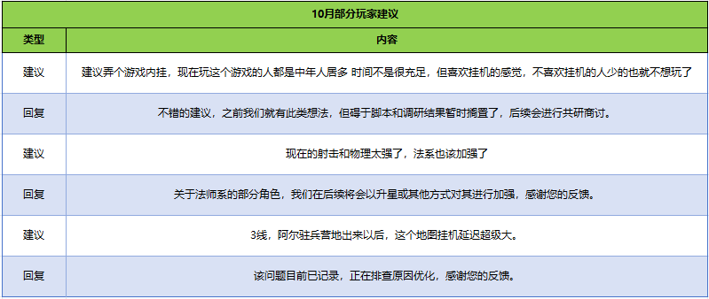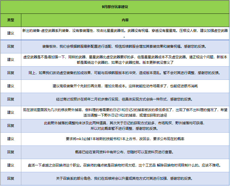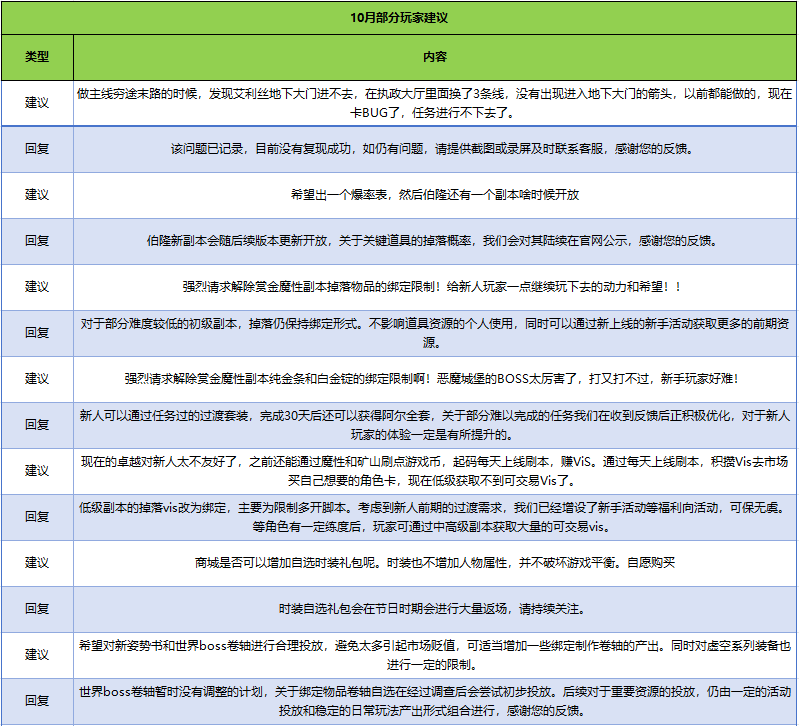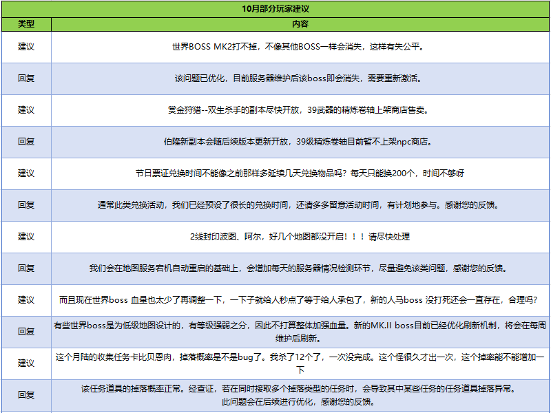 对于大家在9月-10月所积极反馈的建议,运营团队经过认真阅读与仔细讨论,对不同问题逐一进行了答疑回复,旨在解答大家的疑虑和共享后续的运营规划。今后,我们会持续每月定期同步大家的意见建议与我们的处理方案,再次感谢各位的反馈。希望大家不吝言语,有任何对游戏的建议可随时反馈给我们,感谢支持!